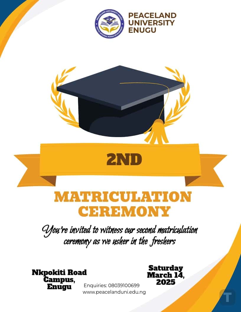 Peaceland University, Enugu, has scheduled its 2nd matriculation ceremony for Saturday, 14th March 2025.